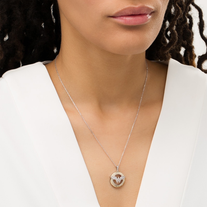 Created in sterling silver and 10K gold, this bold design showcases the "WW" logo sculpted in silver and shimmering with diamonds. Etched diamond-touched stars twinkle along the wide gold rim of the open circle border while the slim silver interior highlights the center. Captivating with 1/10 ct. t.w. of diamonds and a bright polished shine, this pendant suspends along an 18.0-inch cable chain, with an additional closure ring at 16.0 inches, that secures with a spring-ring clasp.This exclusive fine jewelry collection inspires you to wear your strength, confidence and power.